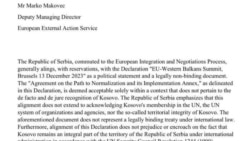 Zyra e Kryeministres së Serbisë Ana Bënabiç, shprehu rezerva për deklaratën e përbashkët duke e cilësuar atë një deklaratë politike që nuk është ligjërisht e detyrueshme.