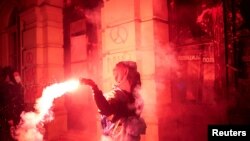 Më herët, demonstruesit e maskuar hodhën vezë, shishe dhe tulla në një zyrë të Partisë Përparimtare Serbe në pushtet.