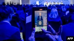 Presidenti Donald Trump duke iu drejtuar virtualisht takimit vjetor të Forumit Ekonomik Botëror në Davos të Zvicrës. 23 Janar, 2025
