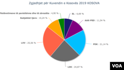 Sipas Komisionit Qendror të Zgjedhjeve, me mbi 98.15 për qind të votave të numëruara, lëvizja Vetëvendosje është në epërsi me 25.55 për qind të votave e pasuar nga Lidhja Demokratike e Kosovës me 24.86 për qind, Partia Demokratike e Kosovës me 21.13 për qind dhe koalicioni AAK-PSD me 11.53 për qind.