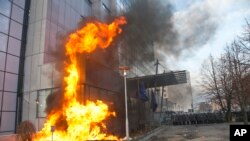 Grupe protestuesish hodhën gurë, mjete piroteknike dhe shishe me benzinë mbi ndërtesën e qeverisë së Kosovës, duke i bënë flakën një pjesë të ndërtesës së saj. Organizatorët e protestës nuk arritën të përmbajnë protestuesit.